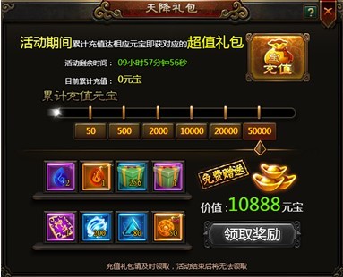 1、活动期间,累计元宝充值达到一定时,即可领取对应档次的充值大礼包(每个档次的礼包最多领取一次)