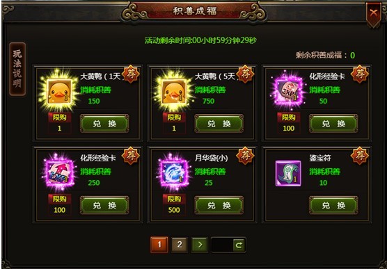 活动期间,元宝消费时1:1返还“积善成福”点,使用积善成福点可以兑换部分道具