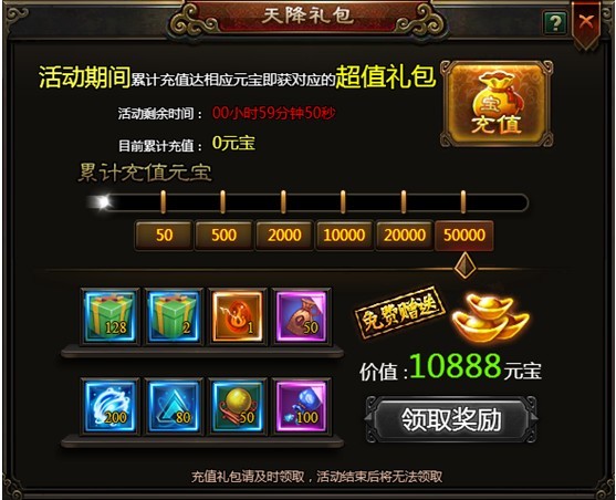 活动期间,累计元宝充值达到一定时,即可领取对应档次的充值大礼包(每个档次的礼包最多领取一次)