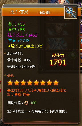 暴击时100%,增加自身法攻 13% |