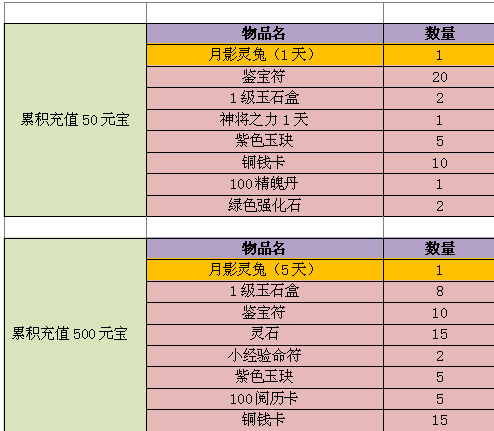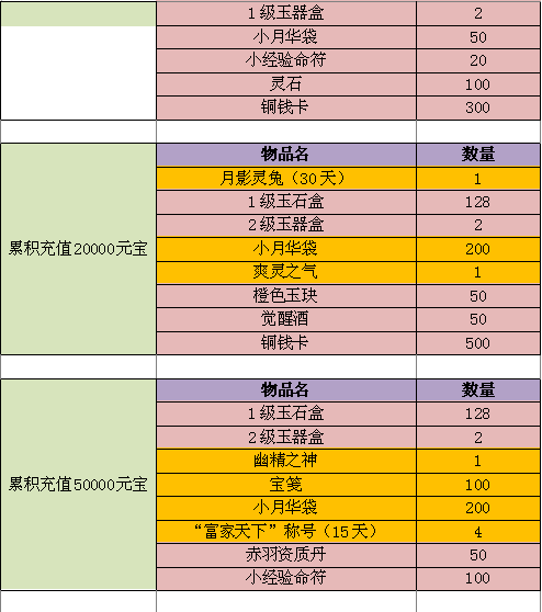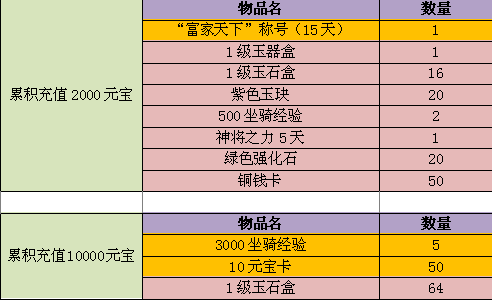 【活动简介】:活动期间,累计元宝充值达到一定时,即可领取对应档次的充值大礼包(每个档次的礼包最多领取一次)