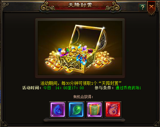 活动期间,每30分钟奖励在线玩家一个“天下封赏箱”,打开“天下封赏箱”有机会获得爽灵之气、胎光之精、玉石、玉器、武将碎片等珍稀道具!
