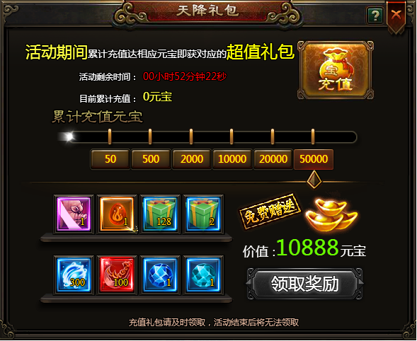 活动期间,累计元宝充值达到一定时,即可领取对应档次的充值大礼包(每个档次的礼包最多领取一次)