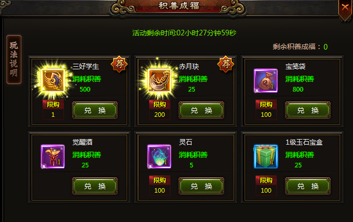 活动期间:消费满500元宝即可兑换永久称号“三好学生”1个,更有赤月玦、宝笺、灵石等稀有道具可以兑换。