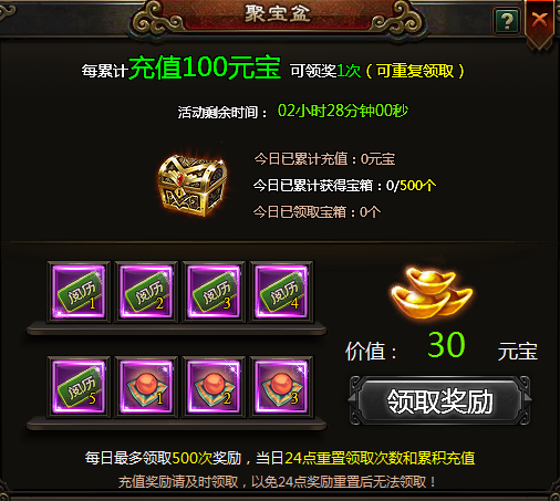 活动期间每充值100元宝可领取1次。