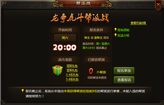 4、 队伍筛选:报名结束后由系统筛选出报名队伍中本周获得帮派经验最多的8个帮派参加帮战,没有获得参赛资格的帮派要加油!