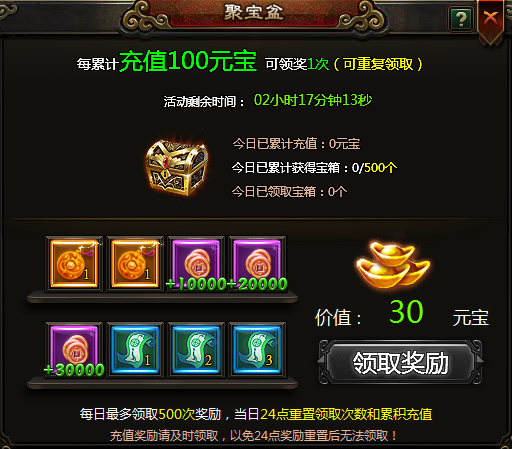1、 活动期间,每累计充值100元宝即可领取一次奖励