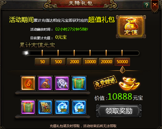 活动期间,累计元宝充值达到一定时,即可领取对应档次的充值大礼包(每个档次的礼包最多领取一次)