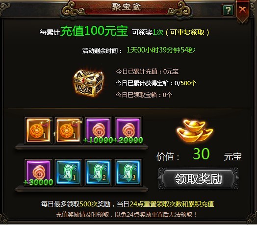 1、 活动期间,每累计充值100元宝即可领取一次奖励