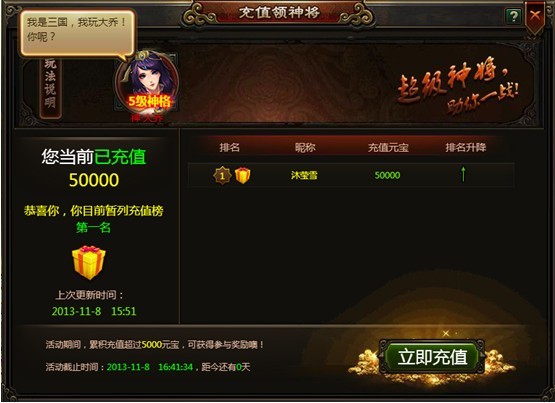 排名奖:活动期间,累积充值满50000元宝且排名前5的玩家可获得