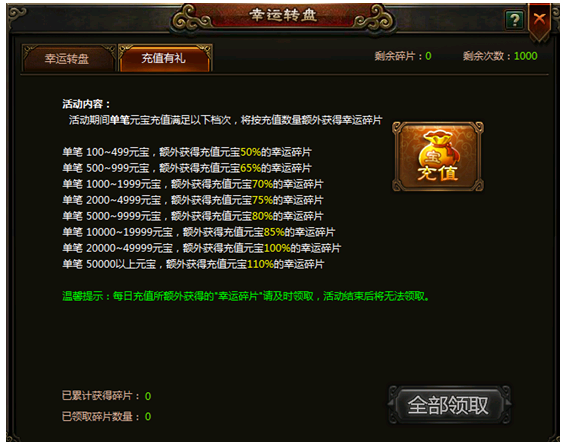 单笔 1000~1999元宝,额外获得充值元宝70%的幸运碎片