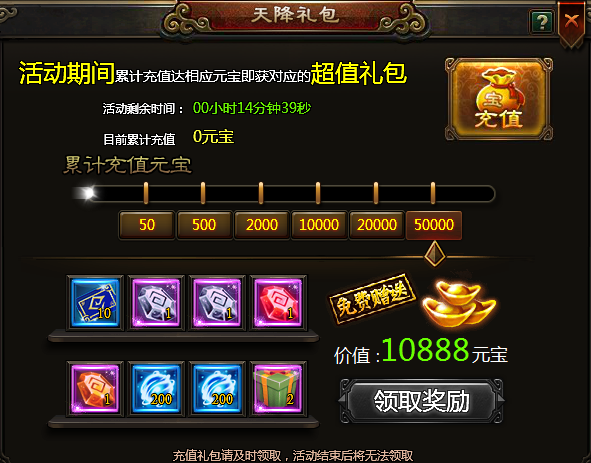 活动期间,累计元宝充值达到一定时,即可领取对应档次的充值大礼包(每个档次的礼包最多领取一次)