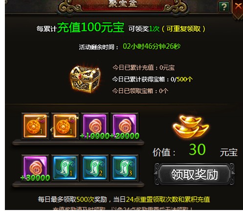 - 活动期间,每累计充值100元宝即可领取一次奖励