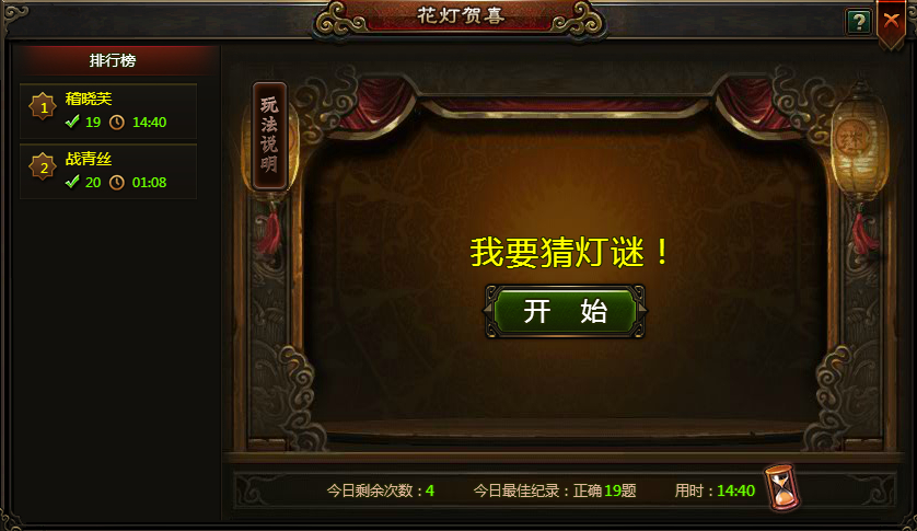 2、 每轮游戏有20道灯谜,最大用时为10分钟