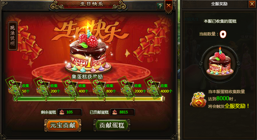 1、 活动期间、收集并贡献出周年蛋糕即可获得奖励锦盒