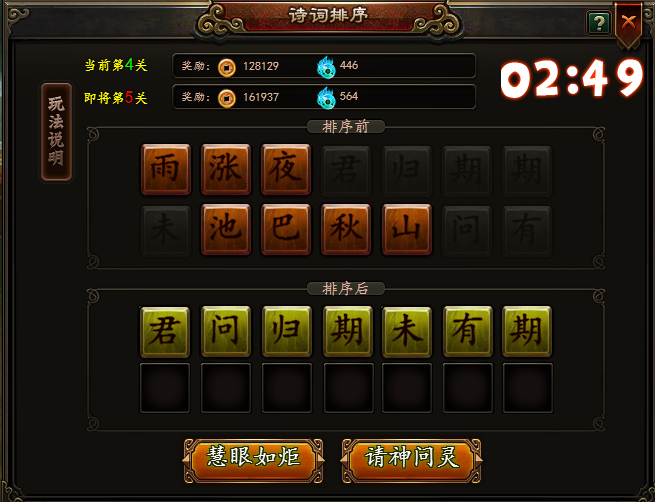 3.游戏开始后,把上方字序错乱的汉字,在下方排列成为一句完整的诗句即可