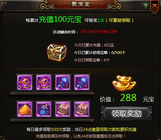 1、 活动期间,每累计充值100元宝即可领取一次奖励