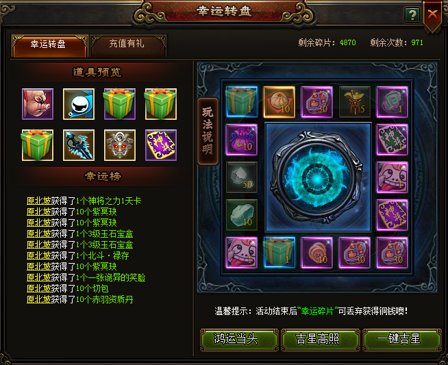 1、 如果想快速获得转盘物品,建议选择“一键吉星”
