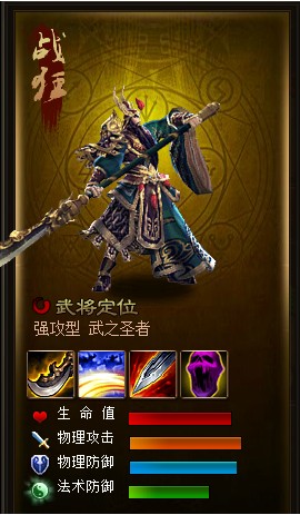 附带“武之圣者”效果:如果敌方单位中有武力小于武圣的战狂,则对起造成的伤害大幅度增加(武力相差越大,伤害越高)