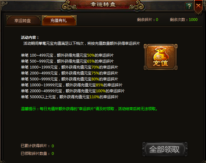 单笔 1000~1999元宝,额外获得充值元宝70%的幸运碎片