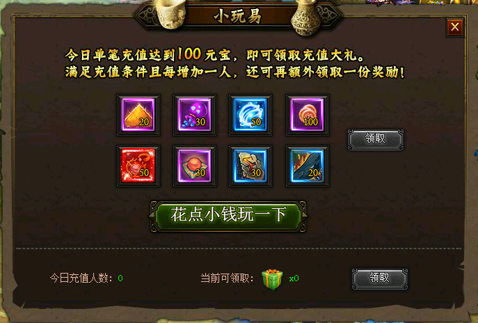 今日单笔充值达到100元宝(含以上),即可领取充值一次大礼,满足充值条件每增加一人,还可再额外领取一份。