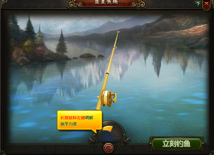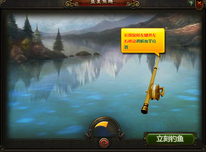 3、 抛竿力度、位置调节完毕后,点击“立刻钓鱼”按钮,则会进入钓鱼环节