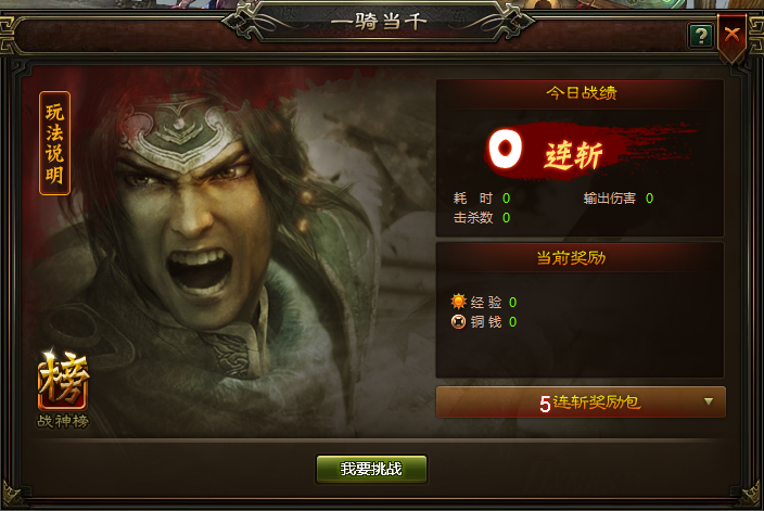 2.进入一骑当千后首先看到的是下图的开始界面,单击‘我要挑战’按钮可进入挑战副本。