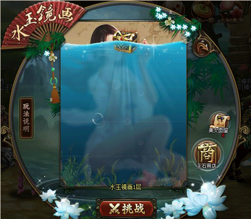 5、神将三国水玉镜画:这个是得水玉币的地方,通关层数越高奖励水玉币越多,每5层有一个BOSS,击杀后奖励一个宝石箱子和一个美女。神将三国玩家可以在水玉商店总换宝石、打孔钻、宝石合成卷轴。