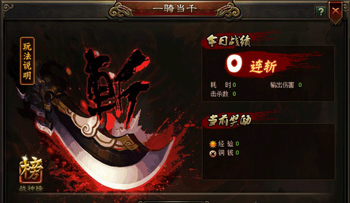 8、一骑当千:神将三国玩家全天可以参加,每5关都为BOSS关。通过关数越多奖励经验和铜币越多。还有技能升级卷轴奖励。