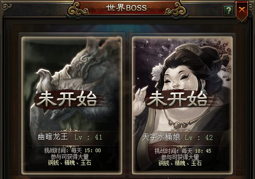 3、世界BOSS;每天有2次参加机会,分别是下午15点和18点45分,玩家进入神将三国BOSS场景后有3分钟的准备时间,这个时间玩家可以用觉醒酒来鼓舞,和用来调整阵型和武将。活动开始玩家跑到BOSS近边就可以进行攻击。玩家也可以选择自动攻击。每次攻击结束后都会有铜钱和精魄奖励。活动结束后会根据伤害排行来发放铜币和精魄奖励。排名前3的玩家会给帮派的成员带来1万铜币的奖励。