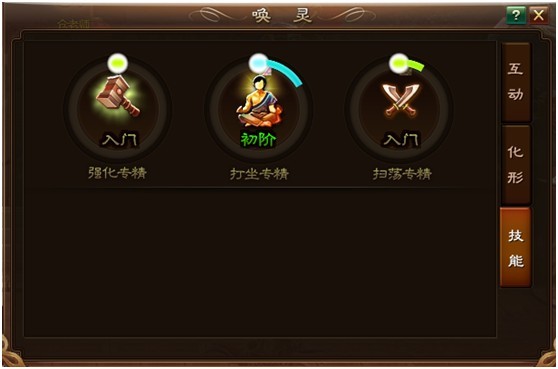 技能页的技能目前只是个展示的作用,还没有实际可以操作的地方。每个技能专精都对应着强化一种游戏里的日常行为,比如强化专精,可以减少强化的冷却时间,打坐专精可以再打坐时获得额外的经验,扫荡专精可以节约扫荡的时间等。也是非常的实用的。这里具体的数值就不研究了,本人不是数据帝,但是大概的流程就是你只要进行了相关的行为,就会为对应的专精技能加经验,经验够了就升级,行为就优化,就这么简单。所以大家每天在线的时候不要吝啬多点一点,总是有好处的。