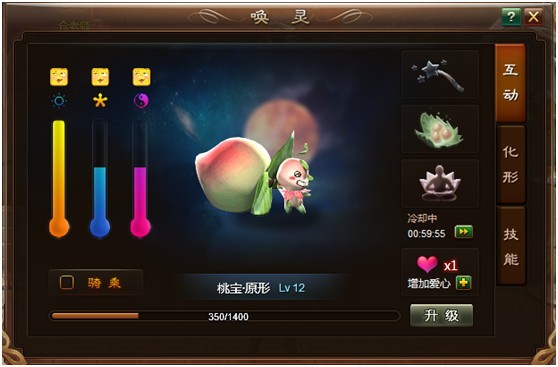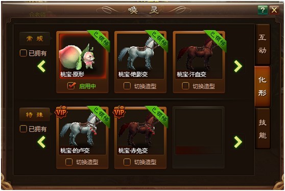 化形页的桃宝各种变,会在桃宝不同等级的时候获得,获得以后可以对其进行骑乘,增加人物在场景中的移动速度,并且部分高级唤灵造型还有着特殊增益,增加互动的收入。这里不推荐刻意去冲VIP获得特殊造型,一般的玩家正常每天点满4次互动获得的唤灵造型就足够了。当然,您要是确实不差钱,也很喜欢这个游戏很支持原创的话,每天冲个几百几千的咱也很认同。。