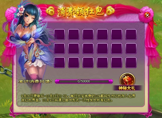 活动规则:所有服务器所有玩家,9月26日更新后开始,至10月8日,每日消费的10%都将作为红包存入仙界派红包界面,消费越多,红包越丰厚, 10月9日,仙界将大派红包,将玩家之前累计的所有消费回馈一次性邮件发送,累计消费回馈达到50000元宝的玩家更有可能获得惊喜大礼哦!