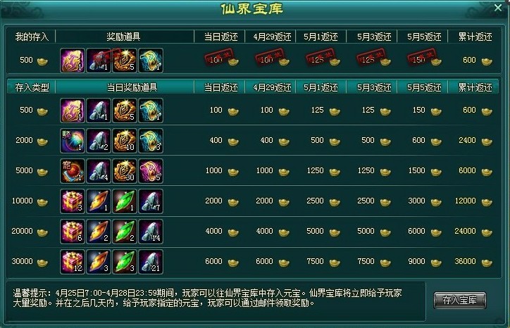 活动规则:活动期间,所有服务器所有玩家,9月26日至9月30日,玩家可以往仙界宝库中存入元宝。仙界宝库将立即给予玩家大量奖励。并在参与活动当天,10月1日,10月3日,10月5日,10月7日,给予玩家指定的元宝,玩家可以通过邮件领取奖励。
