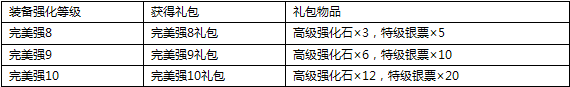 活动内容:活动期间,玩家进行自身装备强化(不包括宠物装备、坐骑装备和时装)并且将任意装备完美强化到一定等级,即可自动获得相应的完美强化礼包。