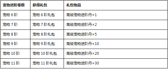 活动内容:活动期间,玩家提升宠物品阶并且达到指定点数,即可自动获得相应的宠物进阶礼包。