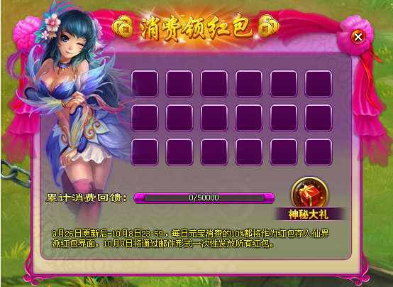 活动规则:开服满6天以上(包括第6天)的服务器所有玩家,10月31日更新后开始,至11月5日,每日消费的10%都将作为红包存入仙界派红包界面,消费越多,红包越丰厚, 11月6日0时,仙界红包将通过邮件进行一次性派送哦!更有可能获得惊喜大礼哦!