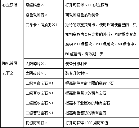 活动规则:活动期间,单笔每充值100元宝可获得系统送出的“充值回馈礼包”1个(单笔充值200元宝可获得礼包2个,以此类推),充的越多送的越多;打开“充值回馈礼包”可获得: