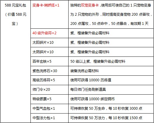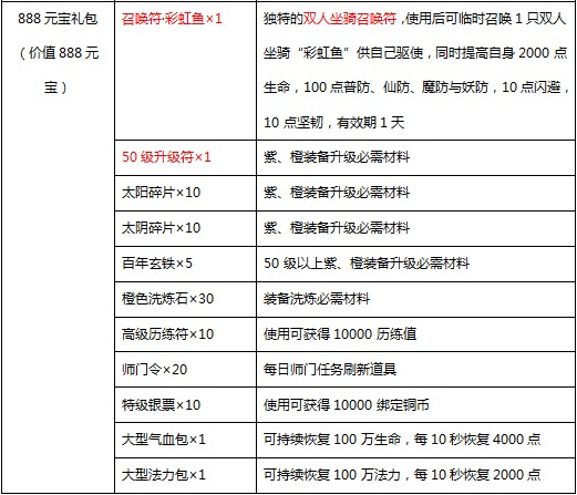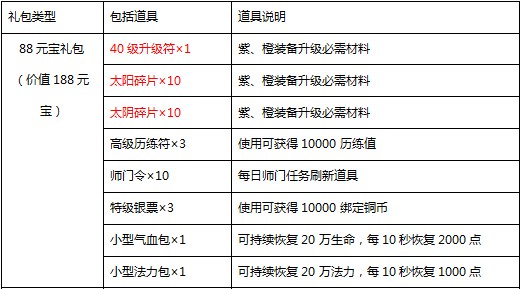 3. 新增每日充值福利界面:开服第8天开始,每天累计充值达到88、588、888元宝,可分别额外免费获得88、588、888元宝礼包各一个,每种礼包每天只可领取一次;打开礼包可分别获得: