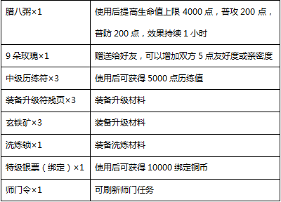 活动规则:活动期间,每日上线即可找活动使者免费领取一个“腊八节上线礼包”,打开礼包可必定获得: