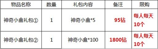 活动内容:活动期间,商城上架【神奇小盒】礼包,打开神奇小盒将随机获得以下物品中的其中一种: