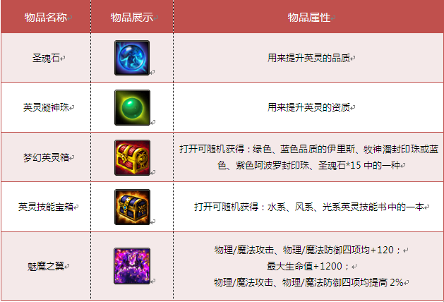圣魂石*50,英灵凝神珠*30,魅魔之翼*1,梦幻英灵箱*10 |