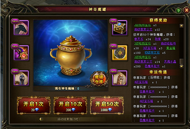 活动内容:魔罐神秘降临,各种丰富道具,狂暴羊驼,恶魔羊驼,5级宝石箱,高级符文,命运石,70级传说之包等着你拿哦~更更更有阿波罗封印珠等你来领取!