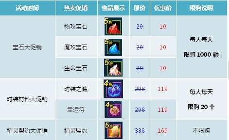 【活动内容】活动时间,商城限时热卖区,物攻宝石,魔攻宝石,生命宝石5折促销,每人每天限购1000颗。还有时装之魄、幸运符、精灵盟约跳楼大甩卖。