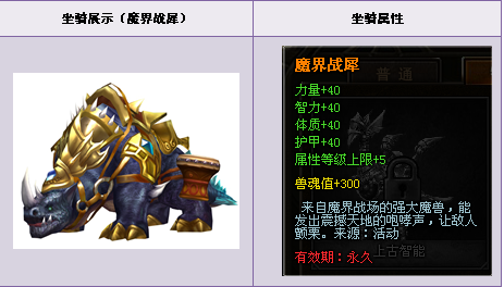 【活动内容】天空之城车水马龙,战斗场内人头攒动,魔界战犀威严助阵,金盔铁甲一展雄风。它愿随君,赤胆忠心,同仇敌忾,威风凛凛,天下谁人不识它与君!活动期间,商城出售超值“魔界战犀”坐骑,快来拥有一只豪杰专属的闪耀坐骑吧,它将踏着星火流云,载着英姿飒爽的你,上战场、下迷宫,破九州,平天下!