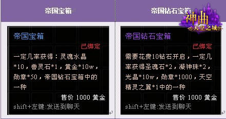 在活动期间,玩家在单人副本、多人副本、地下迷宫、深渊迷宫击杀NPC,每次随机获得帝国宝箱1个。开启帝国宝箱可随机获得大量数额的灵魂水晶、兽灵石、黄金、勋章等道具,同时还有可能随机获得帝国钻石宝箱,内有天空精灵之翼!