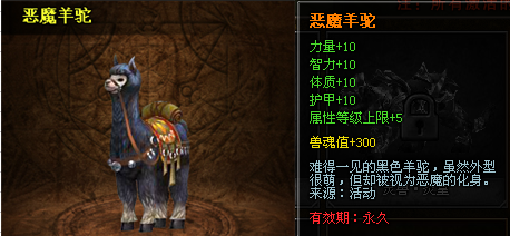 【活动内容】活动期间,商城出售超值“恶魔羊驼卡”坐骑,属性加+10,哦!