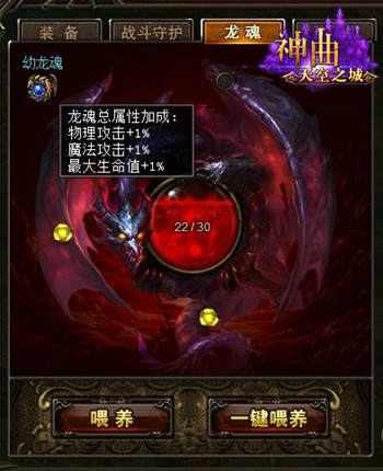 要完成龙魂的进阶,玩家必须对龙魂进行精心的喂养,喂养的道具是“龙神之魂”,可通过多人副本和深渊地宫获得。喂养道具分为喂养和一键喂养,喂养为一次消耗1个道具,一键喂养为一次消耗所有道具。一键喂养时,如果达到等级上限,则只消耗到到达等级上限为止,多于道具不会消耗。