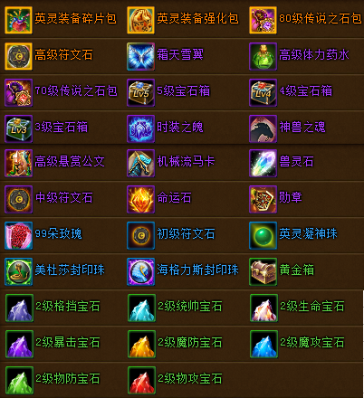 黄金*4000W,英灵强化包*100,黄金圣水*200, 神的祝福*100,神的恩赐*100,11级生命宝石*1 |