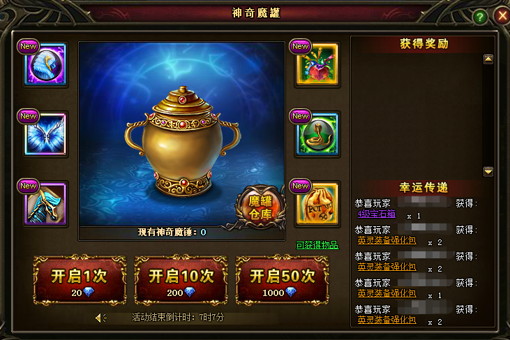 【活动内容】魔罐神秘降临,梦幻通透的珍稀翅膀霜天雪翼,空灵傲然于天空之城。坐骑机械流马(全属性+20),外形奇幻,物种稀缺,魔罐首次亮相。神光笼罩的天空之城焕然一新,英灵的道路更深远,舞台更广阔,同时被赋予更强大的力量,英灵装备应运而生。魔罐特别推出英灵装备碎片包(碎片*10),英灵装备强化包,各种珍稀道具海格力斯封印珠(蓝色),美杜莎封印珠(蓝色),只要你开,即可拥有!
